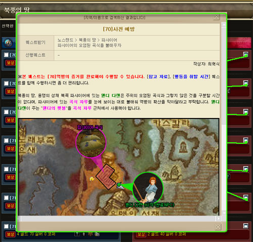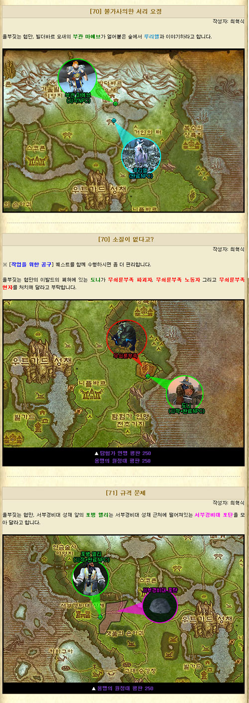 + 지역 퀘스트 한 눈에 보기 원하는 지역을 선택하면 그 지역 내에서 수행할 수 있는 모든 퀘스트가 표시됩니다. 좌측으로는 얼라, 우측으로는 호드 퀘스트가 표시되며, 단일 퀘스트와 연결 퀘스트는 위/아래로 확실하게 구분됩니다. 해당 페이지는 내가 있는 지역의 퀘스트를 한 번에 쭈~욱 보면서 진행하거나, 대부분의 퀘스트를 진행하고서 빼먹은 퀘스트가 있는지 체크할 때 상당히 유용할 것입니다.