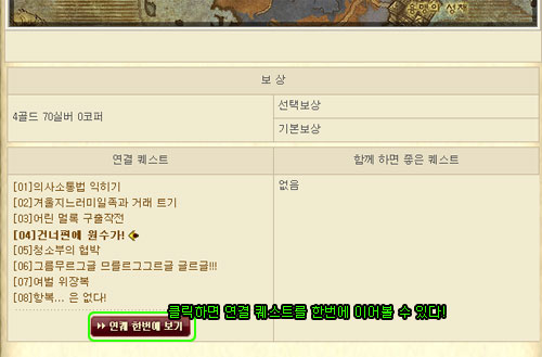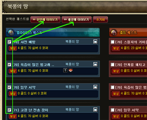 리스트에 표시되는 퀘스트 제목 앞으로는 체크박스가 달려 있는데요, 이는 리스트 상단과 하단에 있는 `선택한 퀘스트를 <한 번에 이어보기>, <새창에 이어보기>` 기능으로 연결할 수 있습니다. 원하는 퀘스트를 선택한 뒤 이어보기 버튼을 클릭해 보세요. 내가 선택한 퀘스트들이 한 페이지 안에서 모두 보이게 됩니다.
