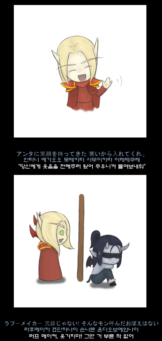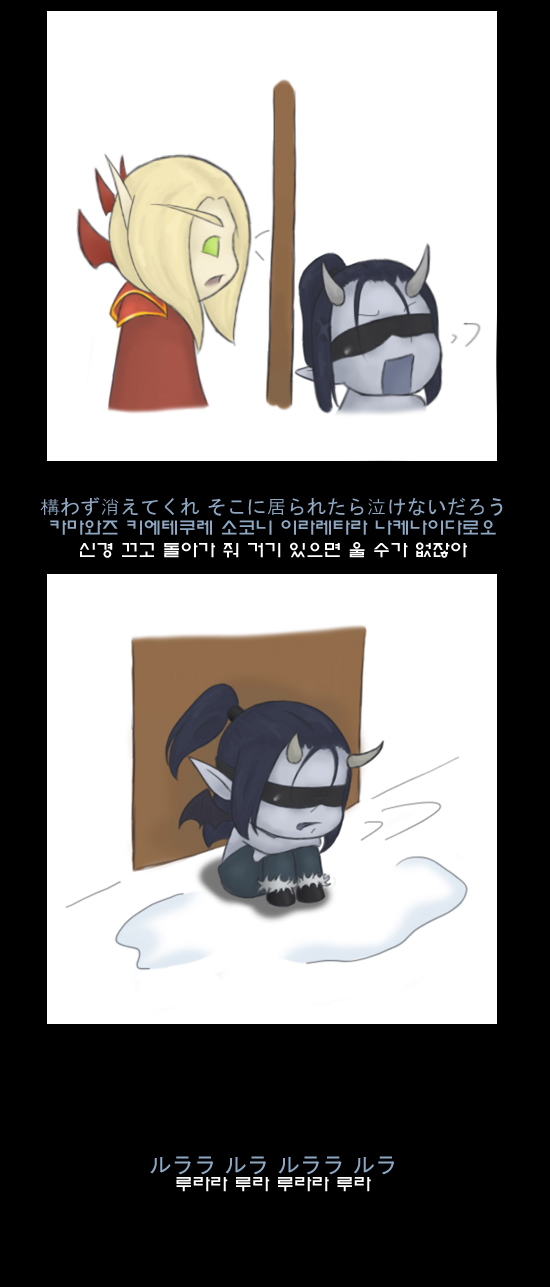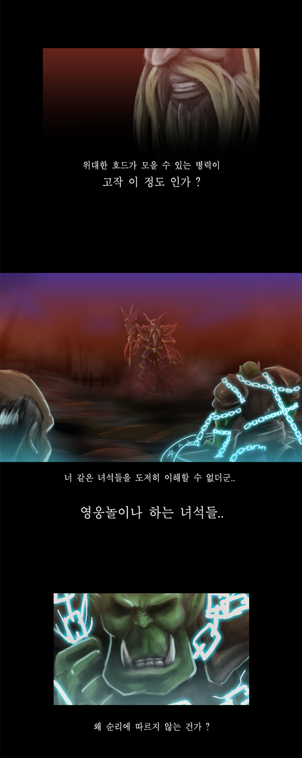프로야구 경기 중에 일어난 사고를 와우버전으로 코믹하게 바꾸어 주셨습니다. 긴 머리를 휘날리며 서리한을 들고 홈베이스로 달려가는 아서스를 보며 제이나는 명대사를 말합니다. "미안해요 아서스, 차마 지켜볼 수가 없군요."