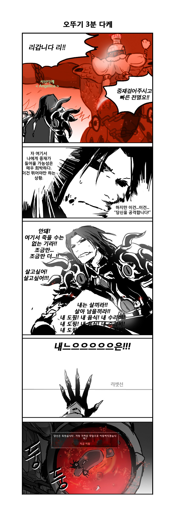 다케님과 꼬멩이흑마님의 실화를 바탕으로 제작된 3분 요리 작품입니다. 울두아르의 보스네임드 용광로 군주 이그니스와의 전투상황을 실감 나게 연출해주셨네요. 용광로 군주 이그니스의 용암재 단지 속에서 모습이 안타까움을 느끼게 하지만 보는 이는 즐겁기만 합니다. 다음에는 꼭 리셋선을 통과하시길 바랍니다.