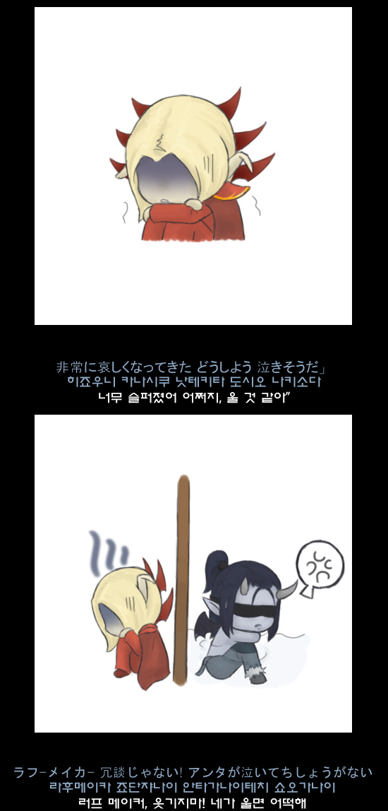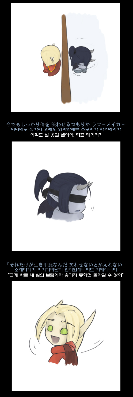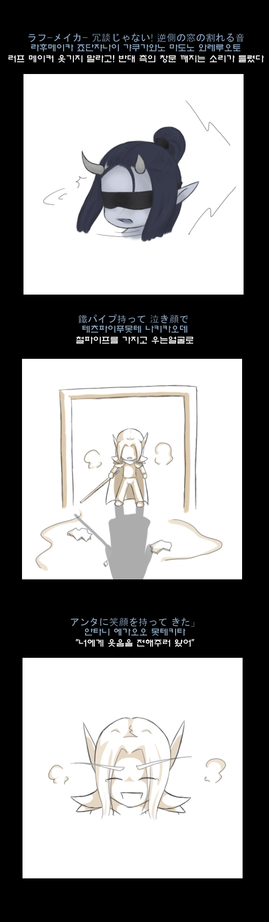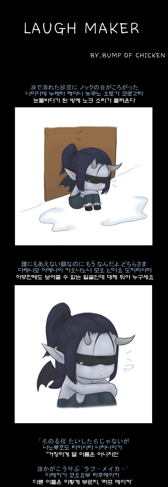 일본의 락 밴드 Bump of Chicken이 2000년도에 발표한 Laugh Maker라는 곡을 토대로 -쉬바르츠-님께서 작품을 만들어 주셨습니다. Laugh Maker(웃음 전도사) 말처럼 주변의 누군가에게 웃음을 가져다준다면 그보다 멋진 일은 없을 겁니다. 찡그린 얼굴을 펴고 한번 크게 웃어보아요. 하하하