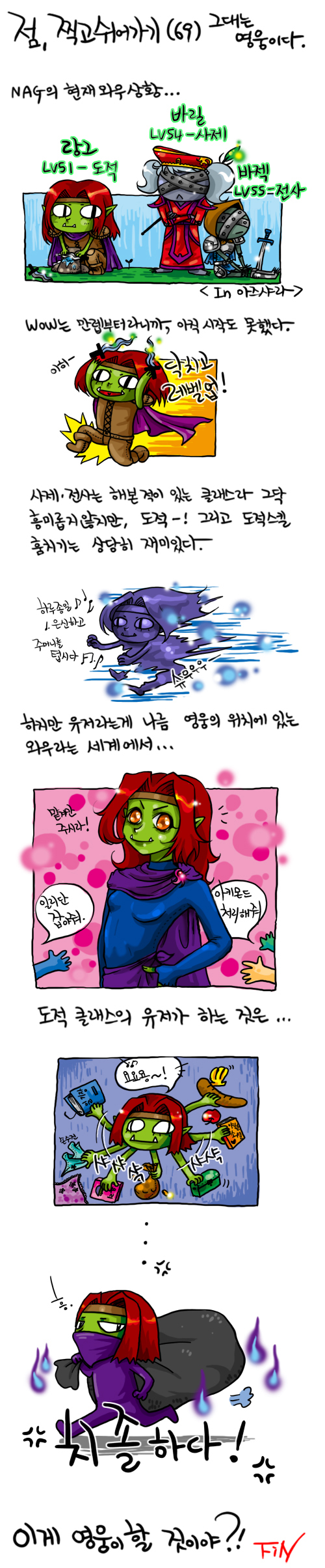 "이미지 갤러리 베스트5" 순위와는 관계없이 매주 와우 카툰을 연재해주시는 NAG 님의 작품입니다. 도적의 잔재미인 훔치기 재미에 푹 빠지셨나봐요. 전 이번 주에 트롤 주사위를 훔쳐서 놀고 있답니다. 재미난 아이템이 나오는 훔치기 같이 해요 NAG님. ^^