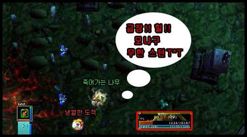 법사님의 걱정스런 표정을 뒤로 하고 자신만만하게 은신한 채로 돌아다니던 나는 갑자기 걸려온 스턴에 당황하면서 눈을 끔뻑끔뻑하였다. 스턴을 시작으로 도적이 모습을 드러내어 내 체력은 기하급수적으로 달기 시작했다. 깃전에서 도적과의 3초만에 끔살을 기억해내고 서둘러 급장을 쓰고 힐을 하려 하였으나.... 어?! 나는 어느새 또다시 하늘을 바라보고 누웠을 뿐이고.