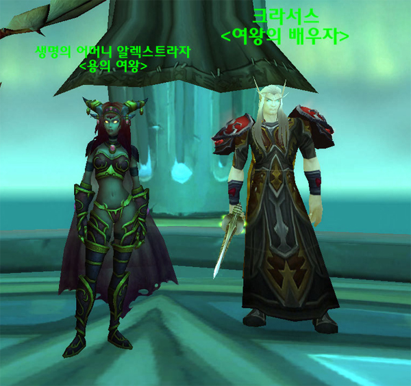 생명의 수호자인 이오나로부터 생명을 보호하는 힘과 권능을 얻게 됩니다. 용의 여왕이자 생명의 어머니가 된 알렉스트라자는 아제로스 세계의 모든 생명체를 보호하는데 자신의 온 힘을 쏟고 있죠. 노스렌드 용의 안식처 고룡쉼터 사원에서 그의 배우자 코리알스트라즈(크라서스)와 함께 있습니다. (현재 알렉스트라자는 용의 안식처 고룡쉼터사원에서 볼 수 있습니다.)