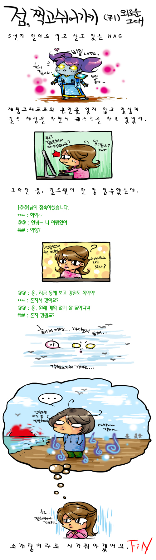 "이미지 갤러리 베스트5" 순위와는 관계없이 매주 와우 카툰을 연재해주시는 NAG 님의 작품입니다. 모든 것을 잊고 어디론가 훌쩍 떠나고 싶을 때가 있죠. 버즈의 노랫말처럼 낡은 하모니카와 손에 익은 기타를 들고 어디론가 슬쩍 떠나볼까요?