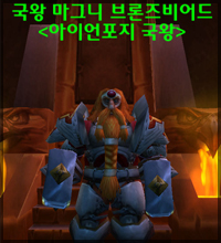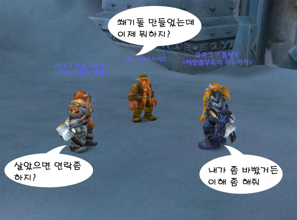 ▲ 마그니 브론즈비어드 ▲ 무라딘 브론즈비어드 ▲ 브란 브론즈비어드 첫째인 마그니 브론즈비어드는 자신의 일족을 통합하고 아이언포지에 정착 마침내 드워프의 국왕으로 즉위하게 됩니다. 드워프들은 그의 통치를 받았으며 마그니 왕은 모든 드워프들의 우상으로 불리죠. 둘째인 무라딘은 아이언포지에 있는 것에 늘 따분하고 지루해하며 언제나 모험을 즐겼고 막내 브란은 탐험가로 정든 고향을 떠나 드워프의 비밀이 있는 곳을 찾아다녔습니다. 전설적인 룬검 서리한이 있다는 이야기를 전해들은 무라딘은 북쪽 차가운 땅 노스렌드로 가게 됩니다. 무라딘은 서리한이 있는 동굴에 도착할 순간 말가니스가 이끄는 언데드 스컬지의 공격을 받아 위험에 처하게 되고 그곳에서 오염된 로데론 왕국의 복수를 맹세하고 노스렌드로 온 아서스 메네실 왕자를 만나 도움을 받습니다. 아서스의 도움으로 무라딘은 서리한 동굴에 도착하게 되고 비극은 시작됩니다. 무라딘의 사망했다는 소식과 마그니 왕의 외동딸 모이라가 검은 무쇠 일족에게 납치가 되고 다그란 타우릿산의 아내가 되어 자살하며 비통함에 젖어 있는 마그니 브론즈비어드에게 막내인 브란이 무라딘이 아직 살아있다는 것을 편지로 알리게 된다.