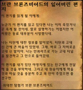 토르모단에서는 브란의 일지를 통해 룬문자 판을 해독할 수 있게 됩니다. `무쇠와 바위의 요람. 울두아르는 폭풍 속에 잠들어 있다.`라는 내용이죠. 티탄과 고대신에 대해 추적하는 브란이 북쪽에 있는 폭풍우 봉우리로 간 것이 확실시되는 부분입니다. 폭풍우 봉우리를 도착하게 되면 폐허가 된 브란의 기지만 있고 브란의 흔적을 찾을 수가 없습니다. 브란을 찾고자 그가 땅에 묻어둔 쪽지를 바탕으로 추적하게 됩니다. 추적자 툴린을 처치하면 브란과 접촉할 수 있는 통신기를 입수하게 됩니다.