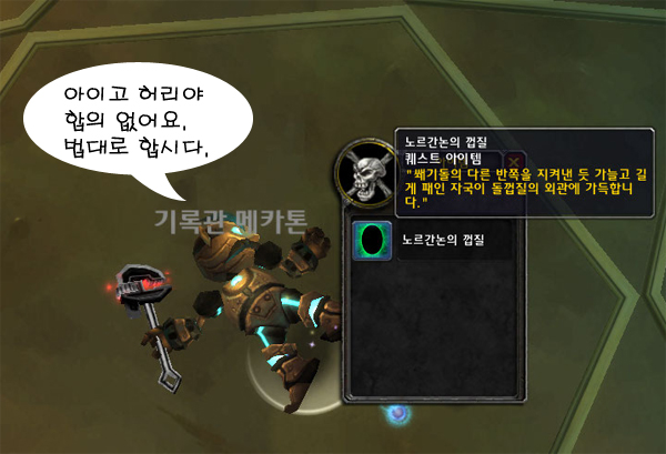 노르간논의 쐐기돌에 대한 단서를 찾아야 한다고 말하는 브란. 쐐기돌은 울두아르 기록에 접근 여부를 관리하는 역할을 한다며 티탄들이 껍질과 핵으로 둘로 나누어 숨겼다고 합니다. 쐐기돌을 지키려고 만들어진 미미르가 많은 장애물을 만들어 놓았으니 조심하라는 경고와 함께 말이죠. 나뉜 쐐기돌의 껍질은 발명가의 도서관에 있다고 말해줍니다. 발명가의 도서관으로 이동하여 발명가의 원반을 입수하고 발명가의 저장고를 열어 숨겨진 정보를 입수하죠. 숨겨진 정보를 바탕으로 노르간논의 껍질을 손에 넣고자 도서관 내부에 있는 조작대로 발명가의 원반을 가져갑니다. 조작대는 발명가의 원반을 사용하여 노르간논의 껍질을 지키는 기록관 메카톤을 가동시키면 된다고 합니다. 기록관 메카톤은 자기를 가동시킨 인물이 미미르가 아님을 알고 공격을 하게 되죠. 기록관 메카톤에게서 얻게 되는 노르간논의 껍질은 쐐기돌의 반쪽뿐이므로 남은 반쪽을 찾아 쐐기돌을 완성시켜야 합니다.