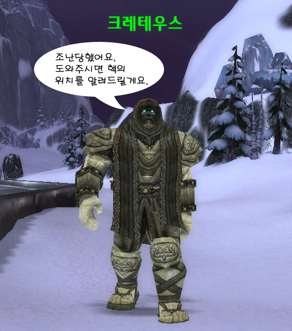 창조주의 기계를 지켜보는 크레테우스는 핵은 이곳에 없다고 말하며 자신을 도와달라고 합니다. 크라테우스는 토림에 대한 정보를 최근에 알게 되어 다른 관리인들의 정보(울두아르의 관리인 미미론, 프레이야, 토림, 호디르)를 알고 싶다고 말합니다. 관리인의 정보를 가져다주면 크레테우스는 심각한 상황임을 눈치채고 핵의 위치를 알려줍니다. 핵은 얼어붙은 무덤 가장 깊은 곳에 숨겨져 있었죠.