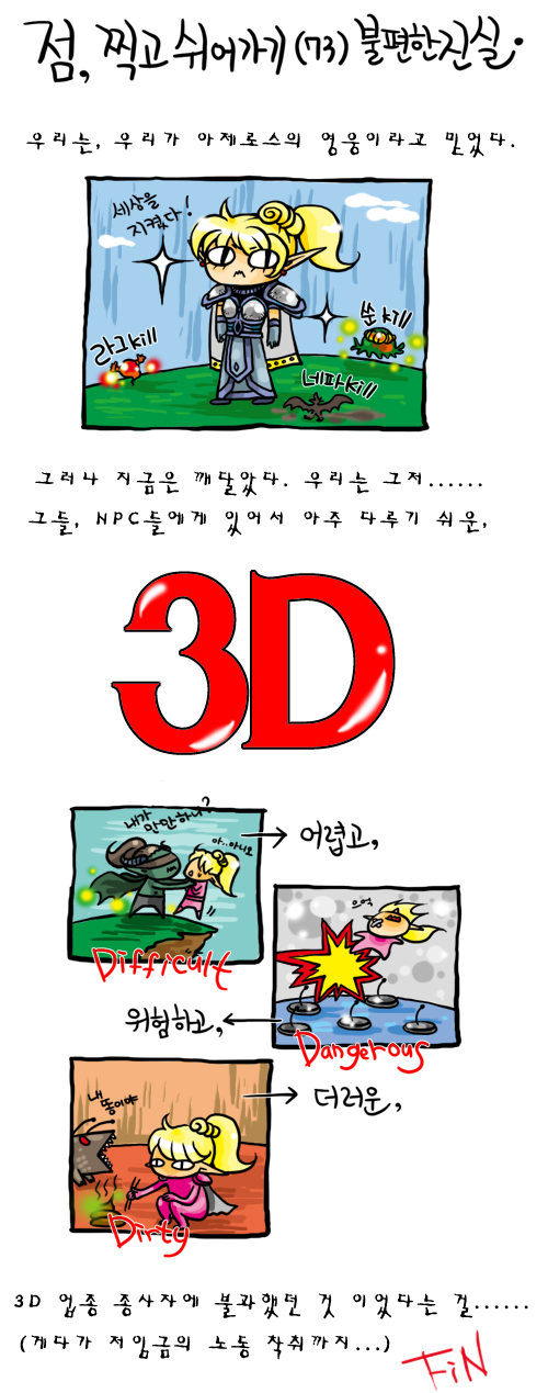 "이미지 갤러리 베스트5" 순위와는 관계없이 매주 와우 카툰을 연재해주시는 NAG 님의 작품입니다. NAG님 말대로 저희는 3D를 겪고 있군요. 그래도 와우를 하게 돼서 NAG님과 같은 분도 알게 된 거니 좋은 거 아닐까요?^^ 시간은 지났지만 NAG님 생일 축하합니다.