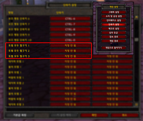 3.2 패치에서 주술사의 필수품인 토템 시전에 혁명이 일어났습니다. 대지, 불, 바람, 물의 토템 4개를 시전하다보면 힐로스, 딜로스가 생기게 마련이었습니다. 토템의 종류도 많아 필요한 토템을 찾는데도 많은 시간이 걸렸는데 쉽게 찾을 수 있고 설정을 통해 4종류의 토템을 한번의 손 움직임으로 시전할 수 있으니 이거야 말로 혁명이라고 할 수 있습니다. (게임설정 -> 단축키 설정 -> 행동 단축키 목록에 있는 토템 모두 떨구기 란에 단축키를 지정하면 보다 편리하게 사용할 수 있습니다.)