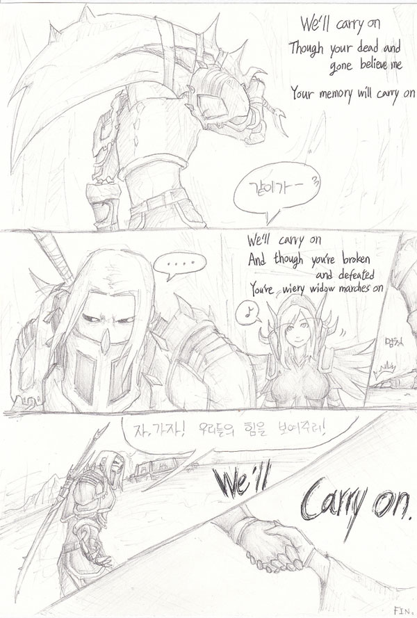 많은 분들이 작품을 클릭해보고 사이즈를 재본 뒤 바탕화면으로 사용하고 계실 거라 생각합니다. 물론 저도 지금 바탕화면으로 사용하고 있죠. BGM은 아쉽게도 처음 들어보는 곡이지만 알렉스트라자, 화이트메인, 실바나스 윈드러너, 마이에브, 제이나까지. 내로라하는 와우계의 여전사들이 총출동한 것만으로도 큰 감동이죠.