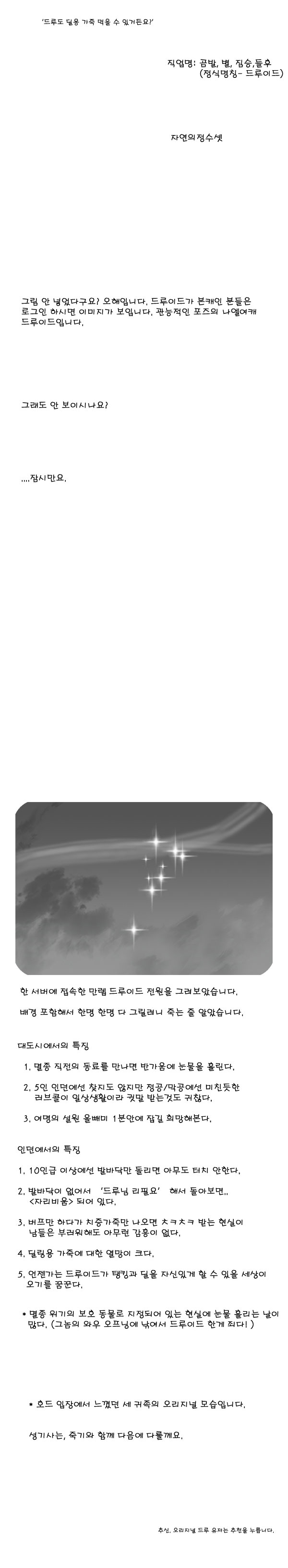 지난주 벨라스트라자에 얽힌 감동의 실화로 이미지갤러리를 눈물바다로 만들어 주셨던(저도 한 10번은 본 것 같습니다), `Amaranth`님의 새로운 작품이 3위를 차지했습니다. 드루이드를 별로 표현해주신 부분은 격동의 오리지널 시절을 겪어본 분들이라면 충분히 공감하리라 생각됩니다.