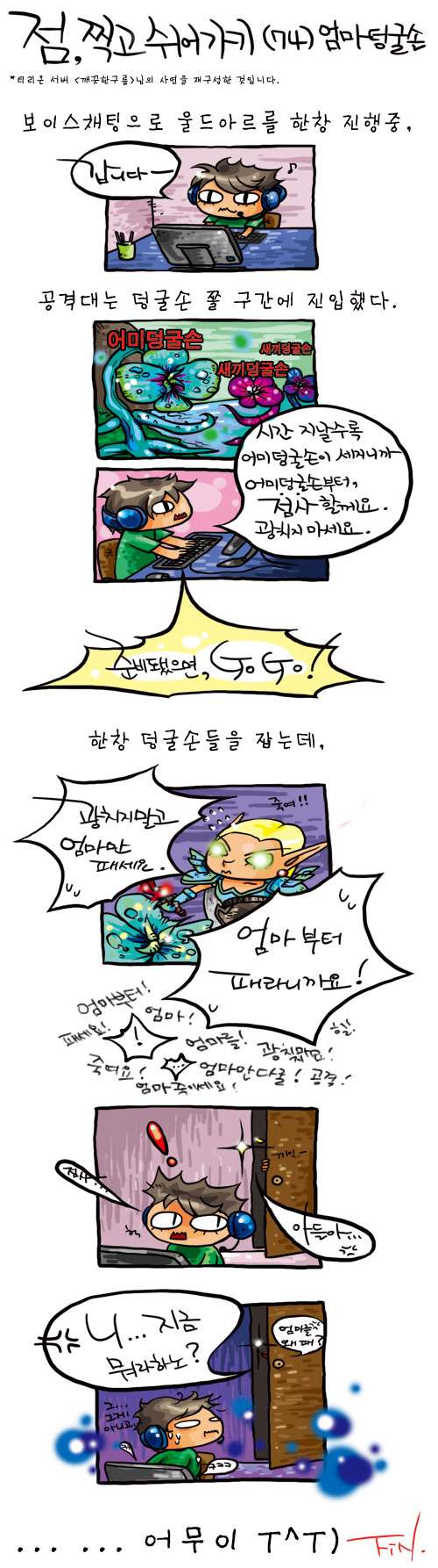 몇 년 째 와우메카를 지켜주고 계시는 수호천사(?) NAG님의 작품입니다. "엄마를 패라"는 와우하지 않으면 어디가서 하소연할 때도 없는 `깨끗한구름`님의 가슴아픈 사연을 맛깔나게 표현해 주셨네요.
