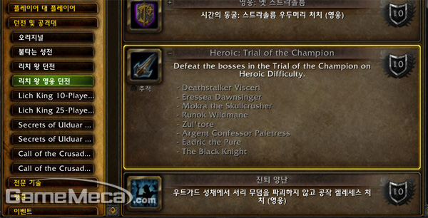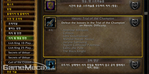 계속해서 정보가 공개되고 있는 3.2 패치 `십자군의 부름`! 테스트 서버에서 살펴볼 수 있는 업적에 의하면 신규 5인 던전인 `용사의 시험장(Trial of the Champion)`의 네임드는 현재 은빛십자군 마상시합 지역에서 살펴볼 수 있는 네임드와 동일하다고 합니다.