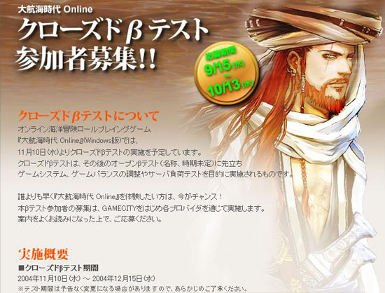 코에이에서 개발중인 MMORPG `대항해시대 온라인`의 베타테스트 일정이 공개됐다. 비공개로 진행되는 이번 베타테스트는 코에이의 제품소개 사이트 게임시티의 회원을 대상으로 하고 있으며, 총 모집인원은 1만 명 수준이다