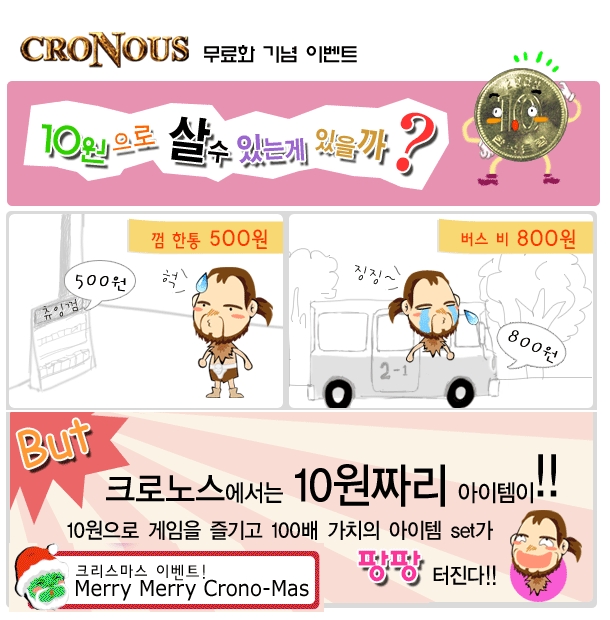 크로노스에서 21일부터 실시한 무료화를 기념해 25일까지 이벤트를 진행한다고 밝혔다. 이벤트 기간 중 크로노스 게임 내의 아이템 샵에서 유료 아이템 10원 이상 구매한 유저를 대상으로 추첨을 통해 +10 3차 이색 부두 방어구 셋트와 성장아이템 등 다양한 아이템 셋트를 제공한다