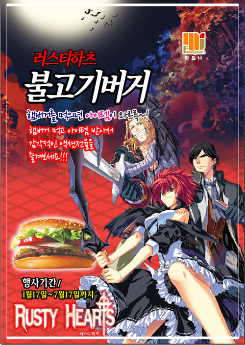 스타일이 살아있는 액션 MORPG ‘러스티하츠’ 는 생동감 있는 3D 액션으로 많은 사랑을 받아왔으며, 대신물류의 불고기 버거와 제휴를 멪어 ‘러스티하츠 불고기 버거’ 를 금일 처음 선보였다. 이번 제휴 관련 이벤트로 ‘러스티하츠 불고기 버거’ 안에 이벤트 쿠폰을 삽입하여 보다 나은 ‘러스티하츠’를 즐길 수 있도록 하였다