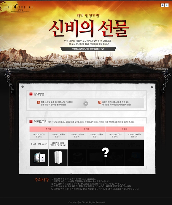 특히 선물로는 아이패드 2가 지급되었으며, 금일(19일)은 최고급 양문형 냉장고를 제공하는 등 앞으로 총 3주간 이벤트를 지속할 예정이다. 이날 아이패드2 경품의 주인공인 유저는 기쁨에 겨워 “저에게 아이패드가…” 라는 글과 함께 스크린샷을 등록하기도 했다.