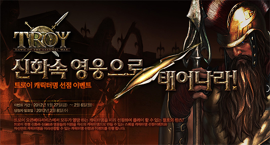 캐릭터명 선점 이벤트 당첨자는 2월 8일 트로이 홈페이지를 통해 발표하며, 스페셜 캐릭터명 당첨자는 OBT 실시 이후 한달 이내에 캐릭터명을 생성해야 하며, 나만의 캐릭터명에 선정된 당첨자는 2월 15일까지 캐릭터명을 지정하면 된다.