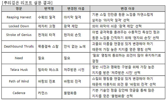 이번 설문조사를 통해 5개의 캐릭터 스킬과 2개의 괴물 등에 대한 영문 명칭이 이용자들의 의견에 의해 반영됐다.
