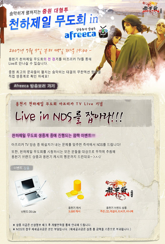 금번 ‘아프리카’ 방송은 `용천기`에서 진행하는 `혈(血)의장: 천하제일무도회`를 생중계하는 것으로, `용천기` 전용채널 (http://afreeca.pdbox.co.kr/dragonskytv)를 통해 금일 9일부터 오는 23일까지 매일 저녁 7시부터 3시간씩 생중계된다.