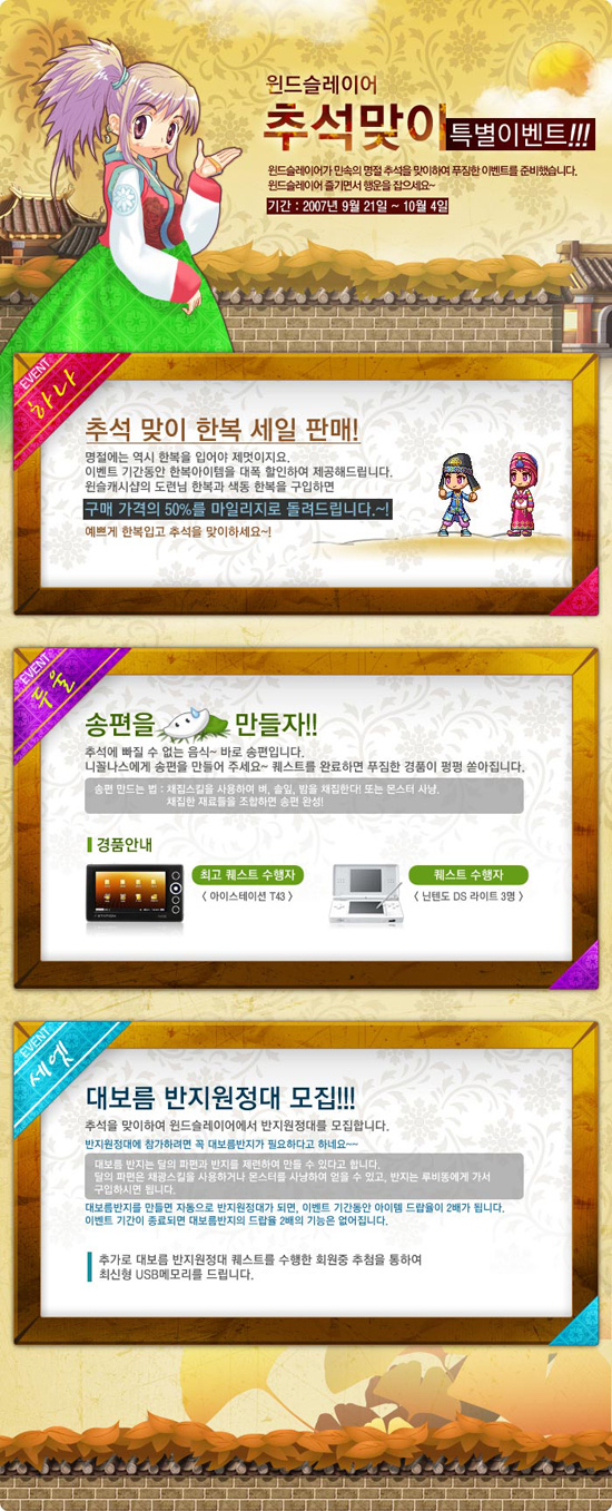 이번 추석 맞이 이벤트는 총 세 가지로 구성되어 있다. 먼저 이벤트 기간 동안 도련님 한복과 색동 한복을 구입하는 유저에게는 결제금액의 50%를 마일리지로 되돌려주는 이벤트가 진행된다. `윈드슬레이어` 유저들에게는 예쁘게 한복입고 추석을 맞이 할 수 있는 절호의 찬스가 될 것이다. 아울러 송편을 만드는 퀘스트를 진행, 게임 내 몬스터로부터 벼, 솔잎, 밤을 채집하여 송편을 완성하면 퀘스트 수행자에게는 아이스테이션, 닌텐도 DS 등의 푸짐한 상품이 지급된다.