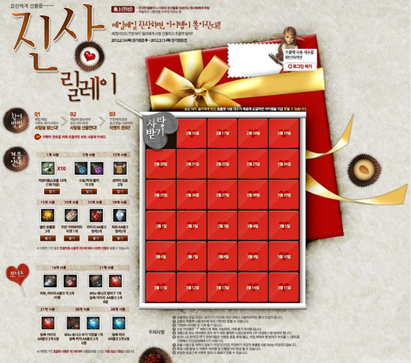초콜렛 사용개수에 따라 거점 이동 스크롤, 수호/파괴 물약, 프란의 가방 개수를 늘려주는 성약의 징표, 열린 유물함, 프란 가위바위보 티켓, 강화 아이템 원석 카이지 AA랭크 원석과 히라 AA랭크 원석을 지급한다.