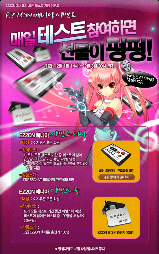 레트로 게임즈는 2월 1일 부터 3일까지 `EZ2ON`이 프리오픈 서비스에 참여한 유저들을 위한 “EZ2ON 매니아 이벤트”를 실시한다. 프리오픈 서비스 기간 동안 `EZ2ON`에 접속해 7레벨을 이상을 달성한 유저에게는 추첨을 통해 총 5명에게 경문엔터테인먼트에서 제공한 리듬액션 전용 컨트롤러인 ‘SSC-NT’를 제공한다