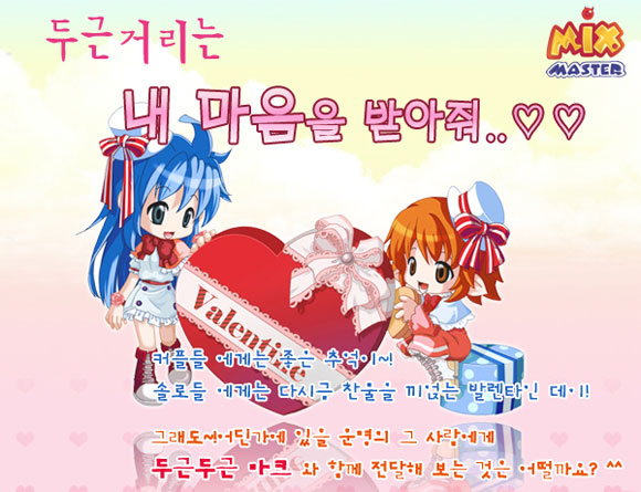 시드시코리아에서 서비스하는 믹스마스터 온라인이 2008년 발렌타인 데이를 맞이해 이벤트를 실시한다. 믹스마스터는 2월 14일 발렌타인 데이를 기념하여 “두근거리는 내 마음을 받아줘~♡” 이벤트를 진행한다