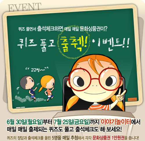 퀴즈는 하루 한번씩 출제되고 퀴즈의 정답을 맞춘 참가자 중 매일 5명씩 추첨하여 문화상품권을 증정한다.