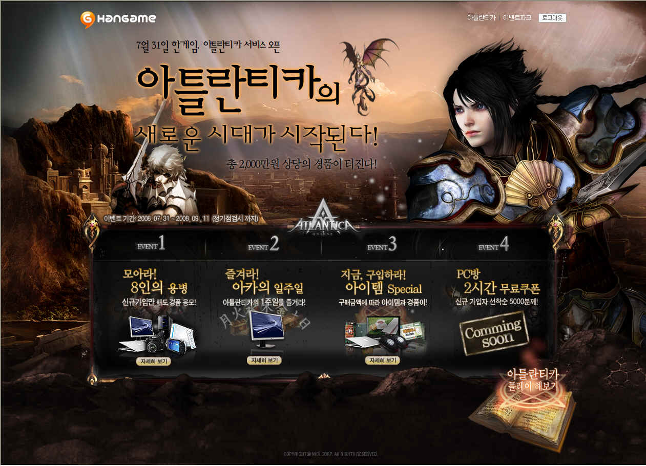 한게임은 ‘아틀란티카’의 오픈을 기념해 오는 9월 11일까지 신규 회원이 레벨 10을 올릴 때마다 게임 아이템을 제공하고, 추첨을 통해 PC, 노트북, 디지털 카메라, PSP 등 총 2천만 원 상당의 경품을 증정할 예정이다.