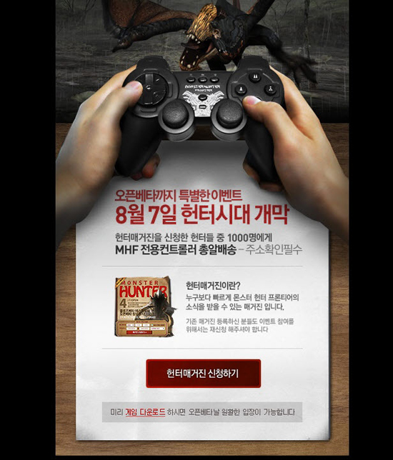 이와 함께 한게임에서는 게임 정보를 확인할 수 있는 ‘헌터 매거진’ 신청자 중 추첨을 통해 오는 7일까지 총 1,000명에게 ‘몬스터헌터 프론티어 온라인’ 공식 컨트롤러를 선물할 예정이다.