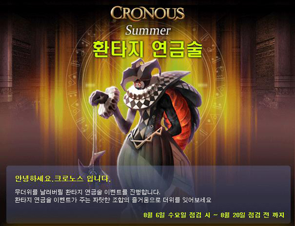 ‘크로노스’ 서비스를 총괄하고 있는 리자드인터렉티브 김의석 이사는 "본격적인 여름 시즌을 맞아 실시하는 크로노스 여름 특별 이벤트 2탄 `환타지 연금술 이벤트`에 유저 여러분들의 많은 참여 부탁드린다."고 밝혔다.