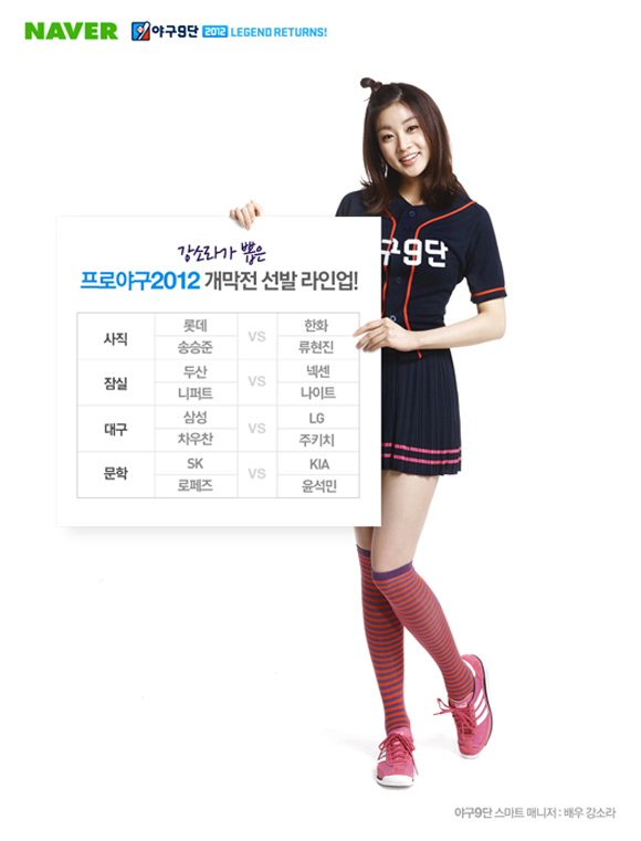 한편, NHN 검색 포털 네이버가 스포츠 페이지를 통해 선보이는 야구 시뮬레이션 게임 ‘야구9단 2012’는 홍보 모델인 배우 강소라가 전하는 8개 구단 2012 프로야구 개막전 선발투수 예상 선발 라인업을 공개했다.