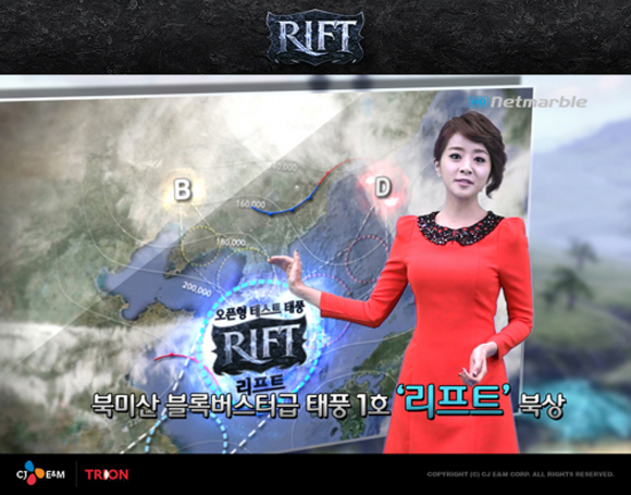 날씨예보 형식의 동영상 공개를 통해 이목을 사로잡은 곳도 있다. CJ E&M 넷마블은 블록버스터 MMORPG ‘리프트’의 날씨예보 영상을 공개해 이용자들 사이에서 화제를 뿌렸다.