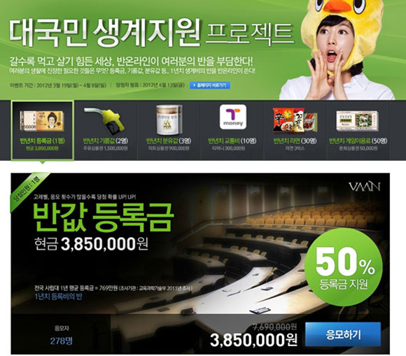 내달 8일까지 진행되는 ‘대국민 생계지원’ 이벤트는 추첨을 통해 1명에게 ‘반값 등록금’ 3백 85만원을 지급하고, 이 외에도 반년치 기름값(2명), 반년치 분유값(3명), 반년치 교통비(10명) 및 반년치 라면(30명)과 문화상품권(50명) 등을 지급한다. 이벤트 참여방법은 ‘반 온라인’의 이벤트 페이지에 접속하여 응모하기 버튼을 눌러 참가할 수 있으며 당첨자는 4월 13일에 발표된다.