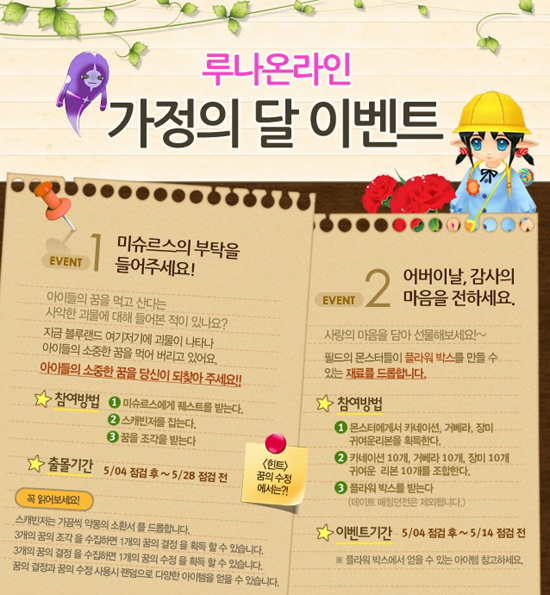 이야인터렉티브가 개발하고 SK텔레콤이 서비스하는 커뮤니티 MMORPG ‘루나온라인’이 5월 4일부터 5월 28일까지 가정의 달 이벤트를 실시한다.