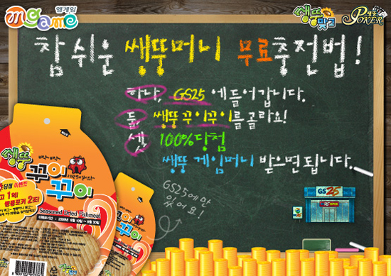 게임머니는 전국의 GS25 편의점에서 쌩뚱 꾸이꾸이를 구매하고 제품 포장지에 삽입된 쿠폰 번호를 확인하고 ‘쌩뚱 맞고, 포커’ 중 자신이 원하는 하나의 게임을 결정 한 후에 해당 쿠폰 번호를 입력하면 받을 수 있다.