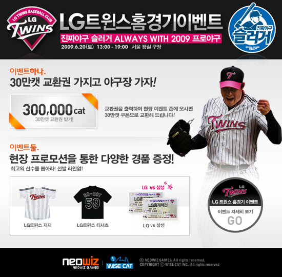 오는 20일 잠실야구장에서 진행되는 이번 이벤트는 ‘슬러거’ 공식 제휴 구단인 LG트윈스와 함께 하는 2009 시즌 첫 번째 행사이다. LG트윈스의 선전 기원과 주말을 맞아 야구장을 찾은 팬들에게 다채로운 재미를 선사하기 위해 마련된 만큼 남녀노소 모두 손쉽게 참여할 수 있는 이벤트로 구성되어 있다.