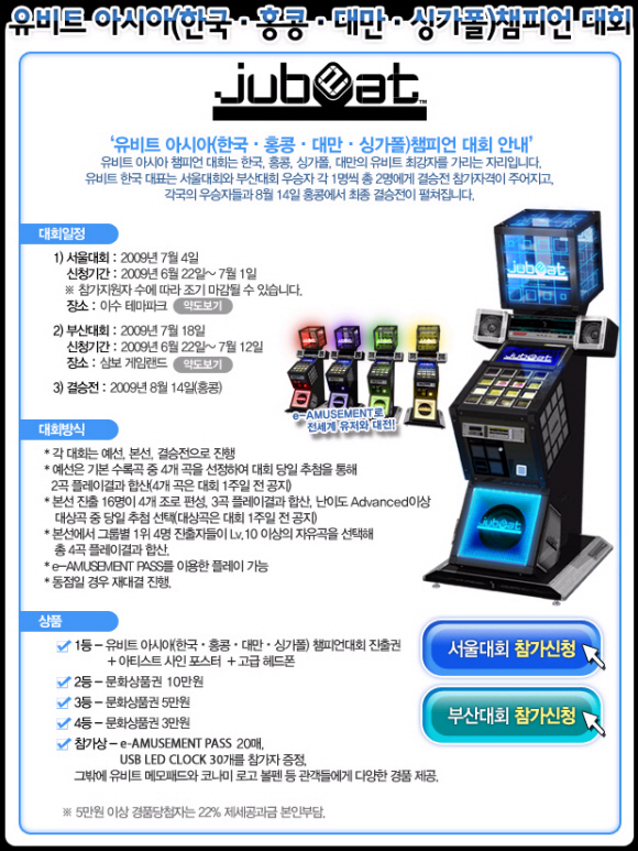 지난 2월 발매된 `유비트(jubeat)`는 코나미 디지털 엔터테인먼트가 개발한 신감각 리듬게임으로, 16개 패널 터치방식의 독특한 게임성과, 지역에 상관없이 실시간 온라인 대전을 즐길 수 있는 ‘e-어뮤즈먼트(e-AMUSEMENT)’ 서비스가 국내 최초로 도입되어 큰 주목을 받았다.