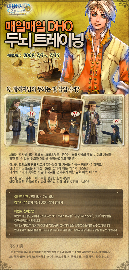 CJ인터넷이 넷마블을 통해 서비스하는 `대항해시대 온라인`이 7월 1일부터 15일까지 합계 명성 500이상의 항해자를 중심으로 매일매일 DHO 두뇌 트레이닝 이벤트를 실시한다. 이번 이벤트에서 세비야 도시에 존재하는 NPC인 토레스, 크리스타로, 롯슈가 유저들에게 두뇌 나이와 지식을 확인할 수 있는 퀴즈와 게임을 준비 했다