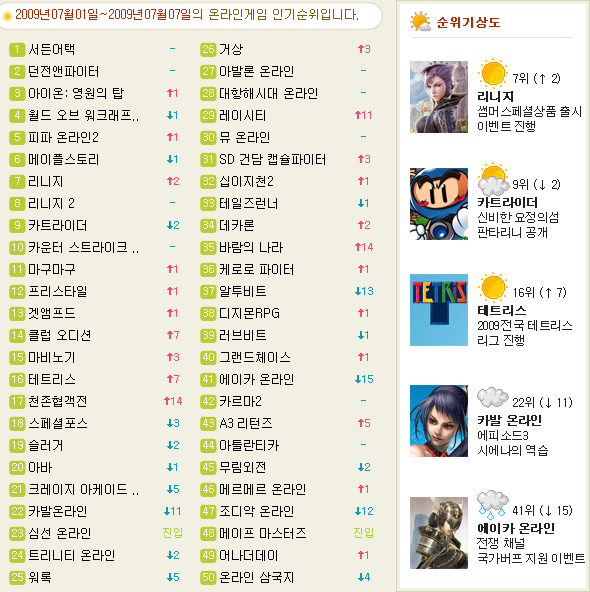 선덕여왕과 미실의 대결, 유산을 둘러싼 선한 여주인공과 악한 여주인공의 대결이 드라마 시청률상승을 주도 중이다. 게임순위에도 맞수전이 대세가 되는 것일까? ‘서든어택’과 ‘던전앤파이터’가 정전모드를 유지하고 있는 상황에서, 게임 순위에도 맞수, 라이벌 전쟁이 뜨겁다. 최대 승부처가 되는 본격적인 여름방학 시장을 두고, MMORPG 최강자와 ‘국민게임’ 자리를 놓고 치열한 전쟁을 벌이고 있다. 여기에 중국 게임까지 가세했다.