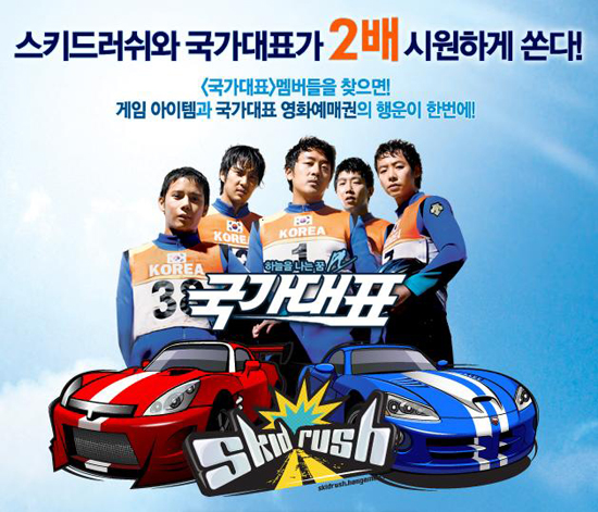 NHN이 운영하는 게임포털 한게임의 레이싱RPG ‘스키드러쉬(http//skidrush.hangame.com)’에서는 신작영화 ‘국가대표’와의 제휴를 통해 총 100명의 게이머에게 영화예매권을 증정하고 다양한 게임아이템을 지급하는 특별 이벤트를 7월 22일까지 진행한다.