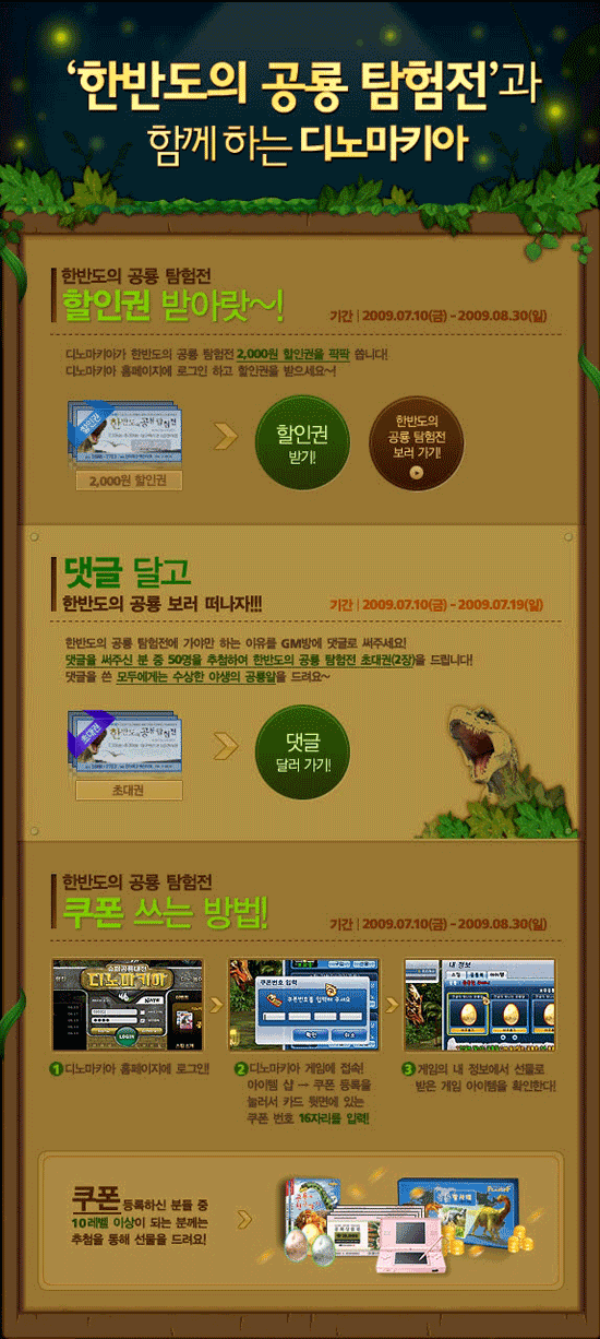 또한 탐험전 현장에서 공룡알, 게임머니 등을 받을 수 있는 `디노마키아` 쿠폰을 배포할 예정이며, 게임에 접속해 쿠폰을 등록한 유저 대상으로 추첨을 통해 닌텐도 DS, 문화상품권, 디노마키아 공룡백과 ‘공룡과 친구하기’, 보드게임 ‘공룡탐사대’ 등 푸짐한 선물을 증정한다.