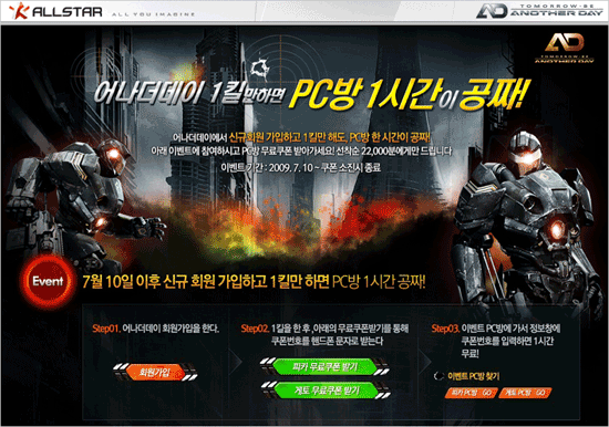 금일부터 시작되는 이번 이벤트는 총 2만2000개의 쿠폰이 소진될 때까지 선착순으로 진행되며, `어나더데이`에 신규 가입한 회원이 게임 내에서 1킬(Kill)을 달성하면 해당 유저의 휴대전화로 PC방 1시간 무료 쿠폰이 발송된다.