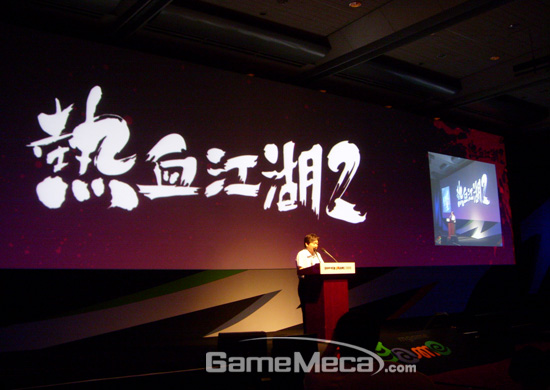 ▲ KRG스튜디오 전진수 대표이사(`열혈강호 온라인2` PM)의 게임 소개 모습, 엠게임의 대표게임이자 글로벌 프로젝트로 진행 중인 `열혈강호 온라인2`는 한자 로고부터 각 나라의 취향과 특성을 모두 고려했다. |