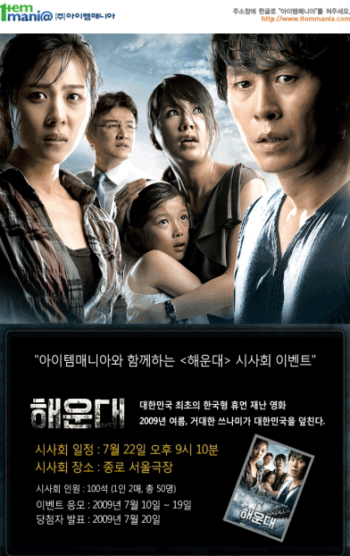 이번 영화 ‘해운대’ 시사회 이벤트는 아이템매니아 회원이면 누구나 가능하며, 시사회 응모는 아이템매니아(http://www.itemmania.com)를 방문해 신청하면 된다. 이벤트 응모기간은 7월 19일까지며, 당첨자는 7월 20일 아이템매니아 홈페이지에서 확인 가능하다.