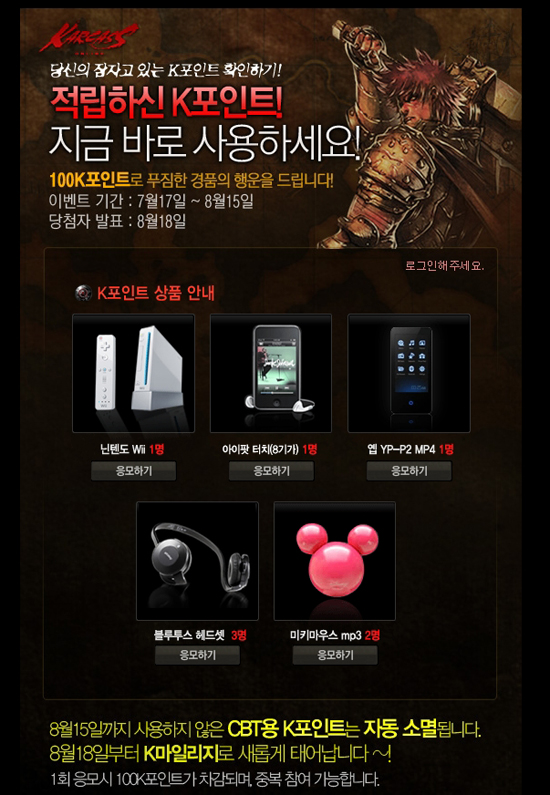 이번 K포인트 경품이벤트는, 클로즈베타테스트 기간 동안 운영되던 K포인트를 아직 사용하지 않은 유저들을 위해 마지막으로 소진할 수 있는 기회를 주고자 마련한 이벤트다. K포인트는 8월말 파이널 테스트에 앞서 K마일리지로 바뀔 예정이며 사용하지 않은 포인트는 소멸된다.