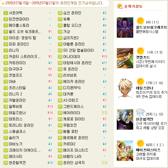 ‘서든어택’, ‘던전앤파이터’, ‘메이플스토리’로 이어지는 상위권은 한 치의 흔들림도 없이 자기자리를 지키고 있다. 남녀노소 고른 지지를 받고 있는 ‘국민게임’의 위력이다. 여름방학 대규모 이벤트의 ‘약발’을 받고 있는 ‘월드오브워크래프’는 ‘아이온’을 제치고 4위로 올라섰다. ‘피파 온라인2’와 ‘리니지’ 역시 방학이나 이벤트와 상관 없는 모습을 보여주며 상위권의 침묵행렬에 동참했다.